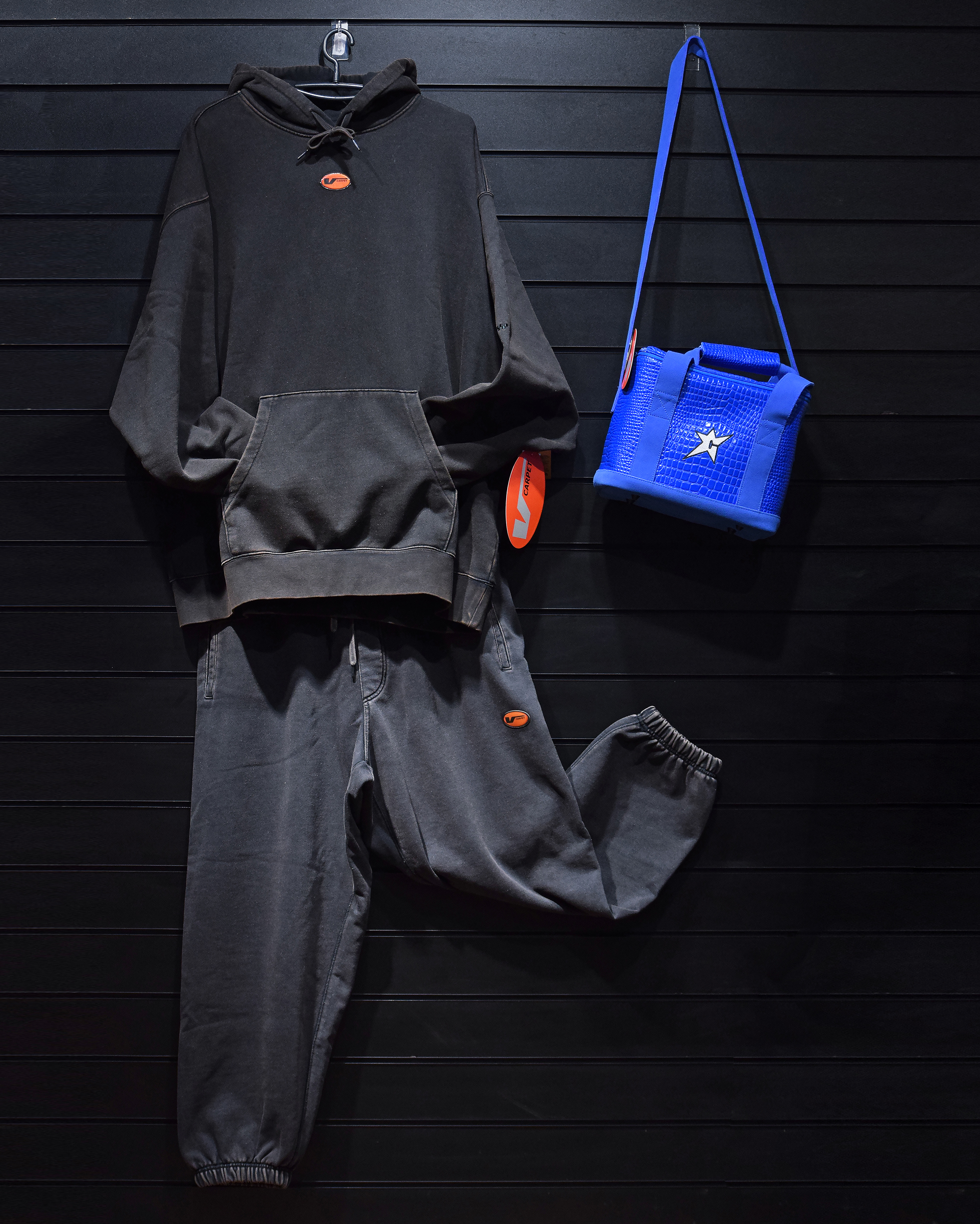 W kolekcji znajdziecie bardzo wygodne baggy dresy, bluzę do kompletu z holograficznymi logówkami oraz bardzo charakterystyczną torbę na ramię.